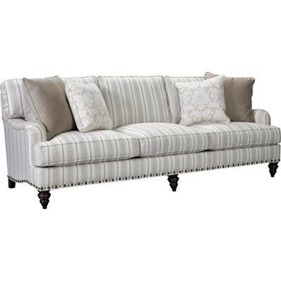 | Additional Information | • Dura Soft cushions • Welted details around cushions and bottom band • Arm height: 25" • Two-sized brass nailheads around the bottom band and back • 2 toss cushions in light brown fabric • 2 toss cushions in patterned fabric • Turned bun feet on the front and saber feet on the back • Feet come in an espresso finish |