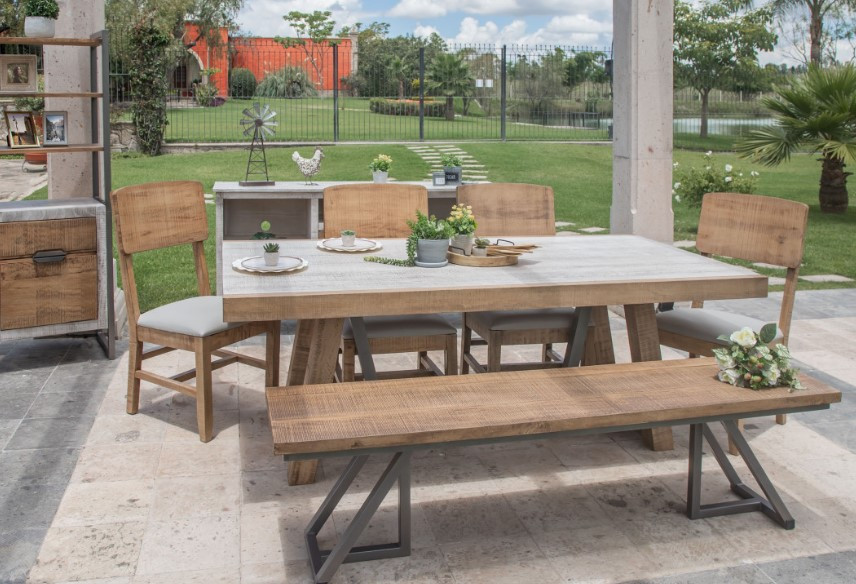 • Iron base on the bench and table adds value and an interesting mixed media look.