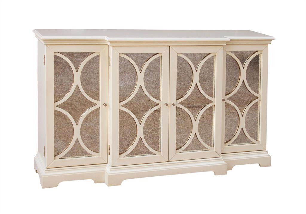 A creamy painted finish and antiqued mirror panels work together in a harmony of hues