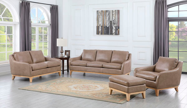 Our Pine Ridge is a full-sized Sofa, Loveseat, Chair, and Ottoman upholstered in luxurious leather throughout, with padded front sides and back. It features a unique curved track arm application, spacious seating, and natural light wood base trim that intensifies the character of the grain giving this piece a one-of-a-kind appearance