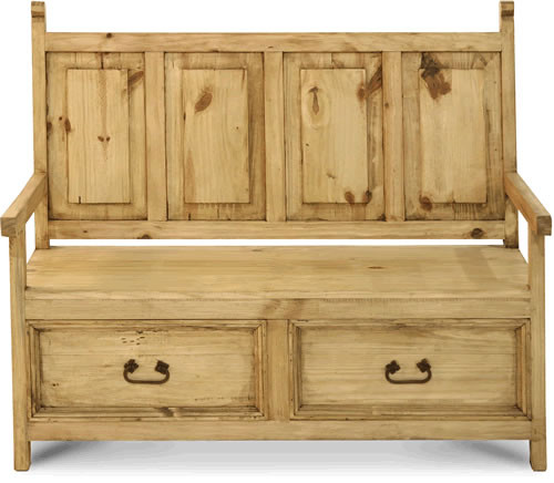 The product is manufactured using the methods established by Mexican craftsman. These century-old traditions create the rustic design and warm appearance that is sought after by our customers. The product is constructed mostly from solid pine that is selected for particular features which lend themselves to the rustic appeal. Knots, blemishes and small splits are all characteristics of natural wood that establish the authentic art of our rustic product. A dark walnut stain is combined with a satin furniture wax before the mixture is sprayed and then hand rubbed on our wood furniture. The soft wood feel and warm color offered is a distinguishing finish. The hardware used has been crafted from stamped metal and oxidized before installation. The product is assembled using rusty nails instead of wood screws, just one more example of how they have taken added steps to ensure the furniture bears the integrity and art created long ago by authentic rustic furniture designers. BAN-5 Monastery Bench Weight: 84 Lbs H x W x D: 44x50x25.6 Shipping Charges are not included on the price of Furniture White Glove Delivery Calculator Call or email us for shipping quote on states not listed here or for deliveries to a business location.
